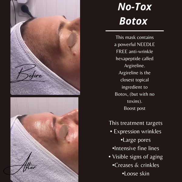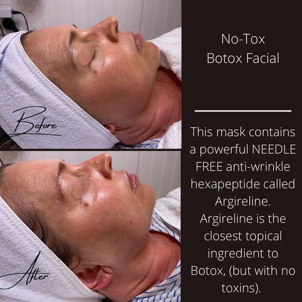 The active ingredient in this facial is Argireline. Nicknamed "'Botox in a Jar", Argireline is a powerful NEEDLE FREE anti-wrinkle hexapeptide similar to Botox, (but not a toxin). Argireline affects the nerve-to- muscle communication, limiting the amount of expression wrinkles in your skin.